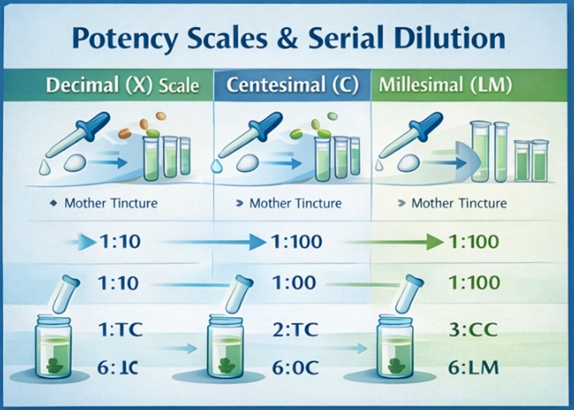 In homeopathy, potency refers to the strength and depth of a remedy’s therapeutic action rather than its quantity. Remedies are prepared through serial dilution and succussion (vigorous shaking), which, according to homeopathic philosophy, enhance the dynamic medicinal properties while minimizing toxicity. Potency scales include: